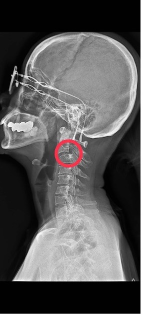 本個案頸椎呈現具極高的危險狀況,任何治療均可能造成神經傷害致癱瘓或危及生命。日常生活需要十分小心。帶防護性的頸圈或許會有幫助。