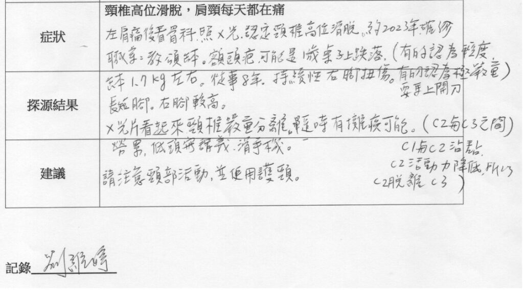 2. 頸椎與胸椎接連處有旋轉性的傷害(未呈直線),造成肩頸肌肉組織持續扭轉傷痛。由1&2推理,本個案或可能是曾經受到嚴重外力傷害所致。