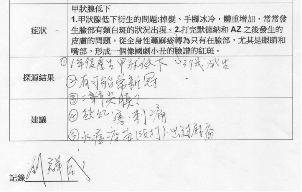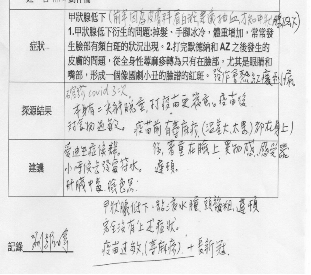 - 個案肝腎解毒功能低下,又是重度長新冠患者,自體產生能量的三焦動力系統受阻,致各臟腑器官功能低下,故易遭受過敏反應。